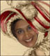 Keira with a gorgeous smile, wearing a lovely white and pink dress with long white gloves.Keira Soleore