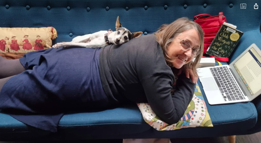 A white dog lying on my back. I have a blue skirt, a black top on and there is a novel next to me. We are on a blue couch.
