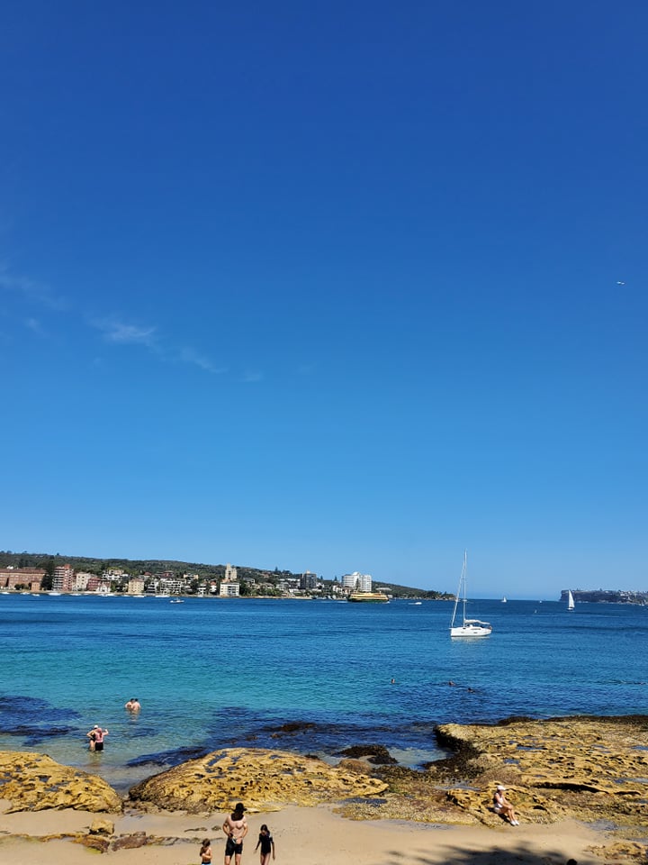 Harbour swimming at Fairlight. Sydney North and South Heads in the distance. Swimmers. Sand. Super yacht.