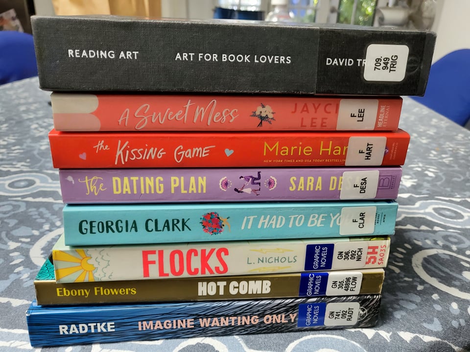 A pile of books. From the bottom up: Imagine Wanting Only; Hot Comb; Flocks; It had to be you; The Dating Plan; Kissing Game; A Sweet Mess; Reading Art: Art for Book Lovevers.
