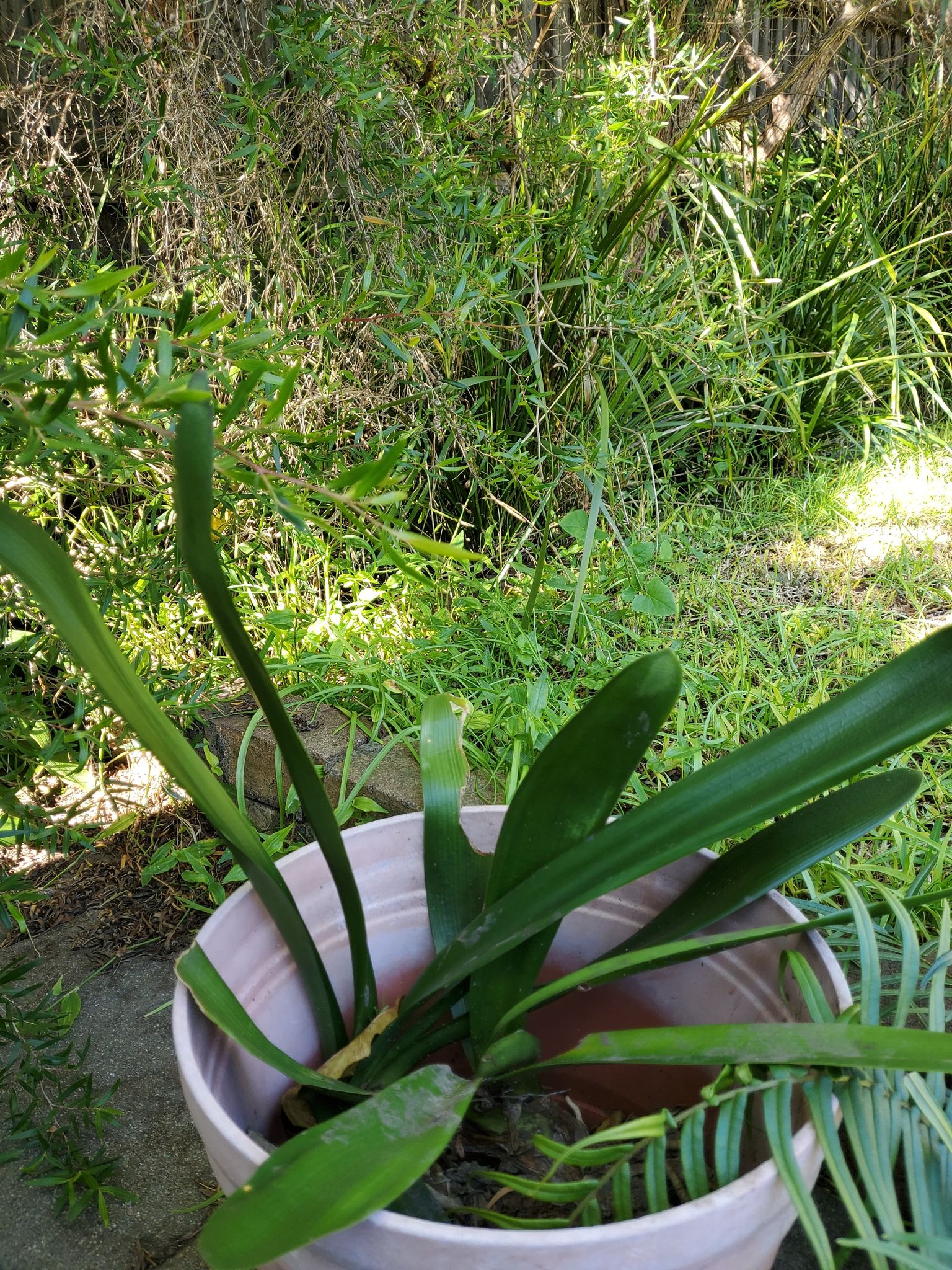 In March last year, my sister-in-law gave me a clivia. She put it in a plastic shopping bag so it wouldn’t drop dirt in my car as my husband drove it home. Carrying many items into the house, he left the plastic bag in a corner, leaves popping out the top. The plant seemed happy enough so I threw some water into the bag, thinking that I need to go out to buy a pot for it. A year later, the clivia was still in that plastic bag. It had flowered in the Spring, I had moved it to the backyard, it dropped its flowers, and it survived the cataclysmic rains of La Nina in February. Then a few weeks ago, I noticed that the plastic bag was disintegrating, so I finally transferred it whole and (nearly) healthy into this pot.